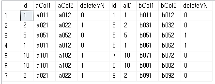 ---- #A Table의 deleteYN이 0인 것들 중 #A Table의 id를 #B Table이 외래키(aID)로 가지고 있는 행만 조인되어 결과로 출력 된다. - 위의 결과와 같다